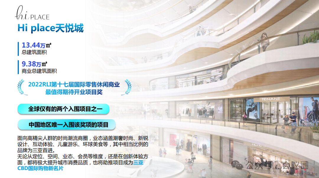 Hi Place天悦城:项目总建筑面积13.44万㎡,商业总建筑面积9.38万㎡,该项目将于2023年12月初开业,此前曾入选2022第17届RLI全球零售&休闲国际大奖——最值得期待开业项目奖,是中国地区唯一入围该奖项的项目。项目坐落于三亚CBD总部经济启动区月川单元,作为三亚未来最具有国际化与现代化生活气息的片区,也是面向高精尖人群的时尚潮流商圈,业态涵盖丰富,其中相当比例的品牌为三亚首进。所以将极大提升城市消费品质,助推项目成为三亚CBD国际购物新名片。