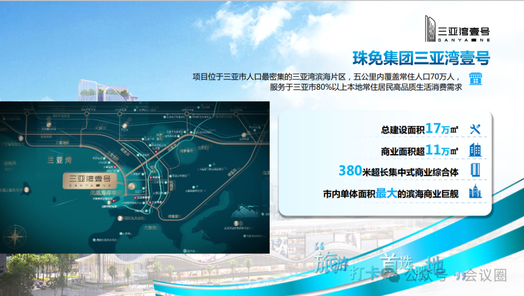 珠免集团三亚湾壹号:项目位于三亚市人口最密集的三亚湾滨海片区,周边配套繁荣成熟、交通四通八达,五公里内覆盖常住人口70万人,服务于三亚市80%以上本地常住居民的高品质生活消费需求。总建设面积17万㎡,商业面积超11万㎡,具有380米超长集中式商业卖场,未来将是市内单体面积最大的滨海购物中心,也将成为游客抵达三亚后,沿着美丽的三亚湾“椰梦长廊”和三亚地标建筑“凤凰岛”海岸线旅游打卡的首选购物胜地之一。