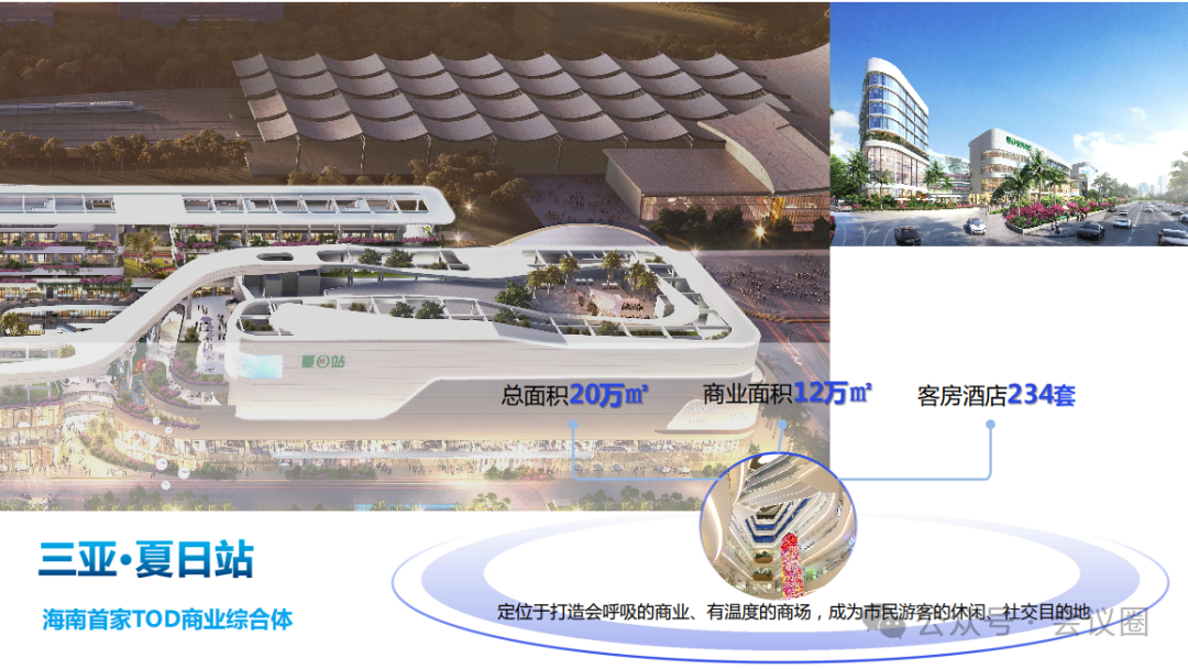 三亚·夏日站:项目由新加坡佳通集团旗下的MAP商业集团投资运营管理,商场位于三亚主城区核心商业地带,与三亚动车站、长途旅游客运总站、有轨电车总站和城市公交总站实现无缝连接,是海南首家TOD商业综合体。总面积20万㎡、商业面积12万㎡、客房酒店234套,定位于打造会呼吸的商业、有温度的商场,成为市民游客的休闲、社交目的地。