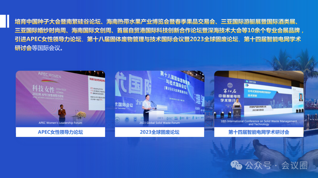 培育中国种子大会暨南繁硅谷论坛、海南热带水果产业博览会暨春季果品交易会、三亚国际游艇展暨国际酒类展、三亚国际婚纱时尚周、海南国际文创周、首届自贸港国际科技创新合作论坛暨深海技术大会等10余个专业会展品牌,推动会展与重点产业相融合,重点展会经济价值溢出效应显著。