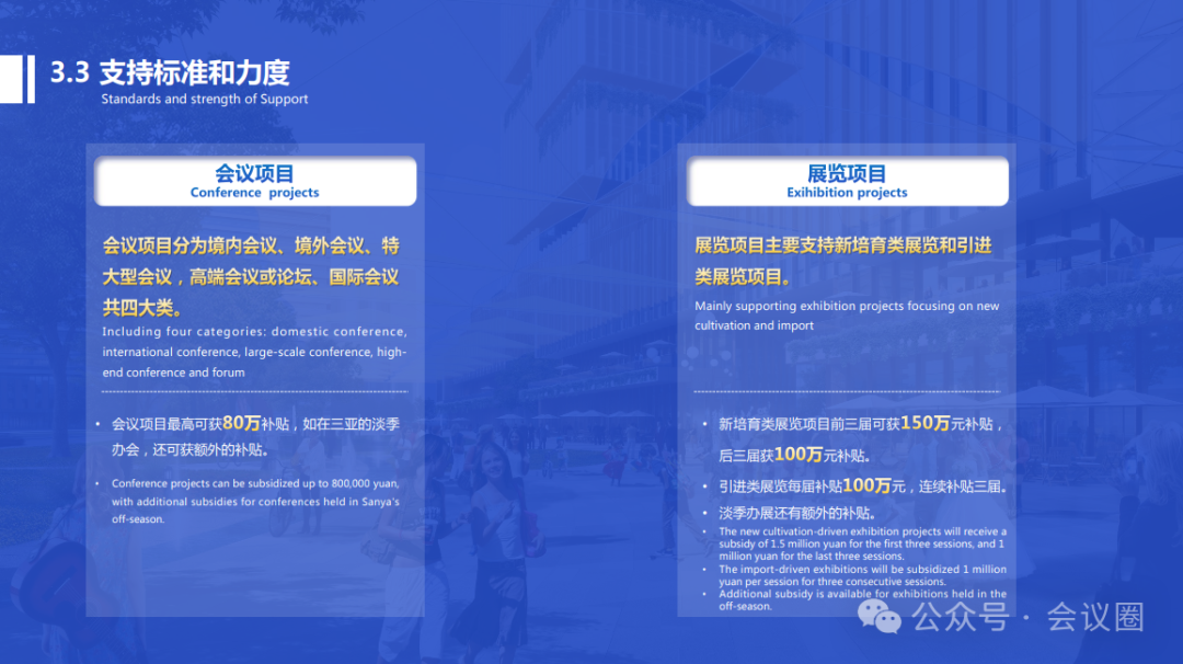 2.展览项目:展览项目主要支持新培育类展览和引进类展览项目。新培育类展览项目前三届可获150万元补贴,后三家获100万元补贴。引进类展览每届补贴100万元,连续补贴三届。同样地,淡季办展还有额外的补贴。