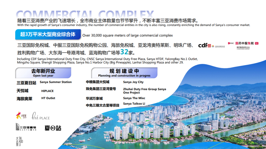 除了现有的32家大型商业综合体,去年刚开业有3家,分别是:三亚夏日站、天悦城、海旅超体;建成正在招商的有珠免集团三亚湾壹号;正在规划建设中的有:中粮集团大悦城、中免三期太古里和华润超级万象城等几个大型项目。