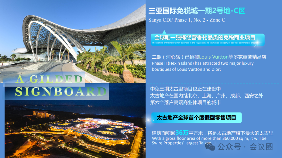 三亚国际免税城一期2号地(C区)项目已经开业,是全球唯一独栋经营香化品类和核心品牌双层旗舰店项目;另外,二期(河心岛)已经进驻了Louis Vuitton等多家有税业态的重奢精品店;还有,中免三期太古里项目也正在建设中,该项目也是太古地产全球首个度假型零售项目,建筑面积超36万平方米,未来将是太古地产旗下最大的太古里项目。