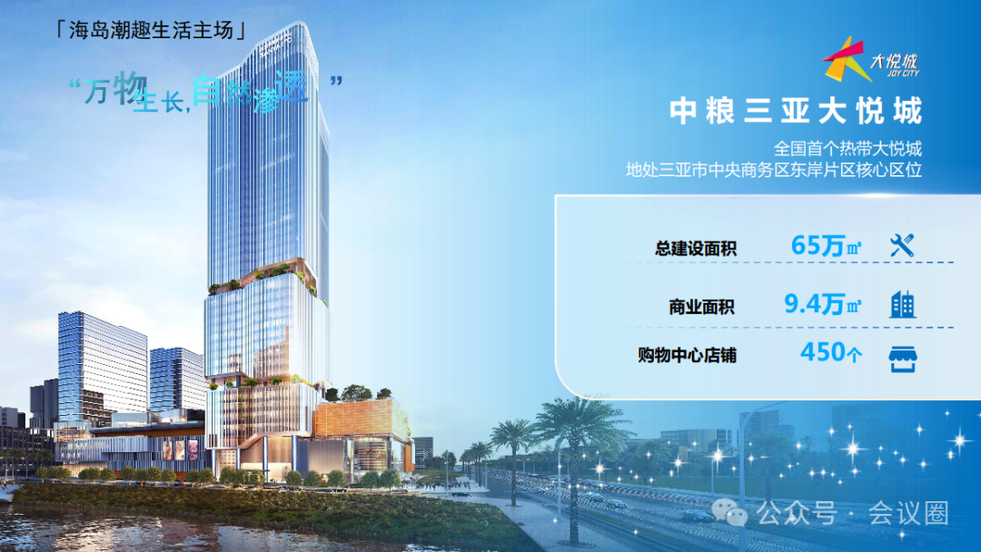 中粮三亚大悦城:地处三亚市中央商务区东岸片区核心区位,是全国首个热带大悦城,项目总建设面积65万㎡,商业面积共9.4万㎡,购物中心店铺达450个,整体设计上,将热带雨林、海南本土文化和艺术融入商业,未来将成为三亚商业高品质、高颜值、超体验的打卡新胜地。该项目计划于2024年正式亮相。