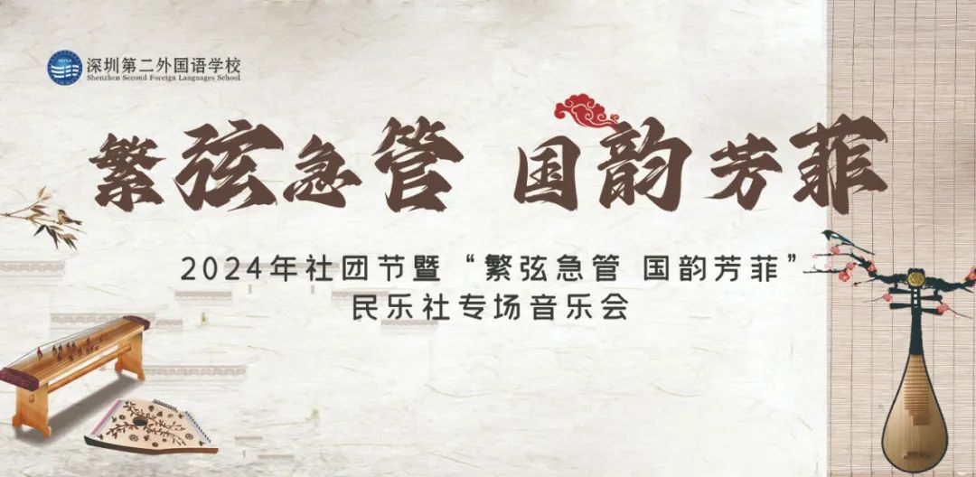 2024年5月15日,在深圳第二外国语学校韶乐厅举办了2024年社团节暨“繁弦急管 国韵芳菲”民乐社专场音乐会,民乐社的同学们表演的民乐曲目让人感受到了中华传统乐器的独特魅力,让人从音乐的韵律中领略到中华传统文化之美。