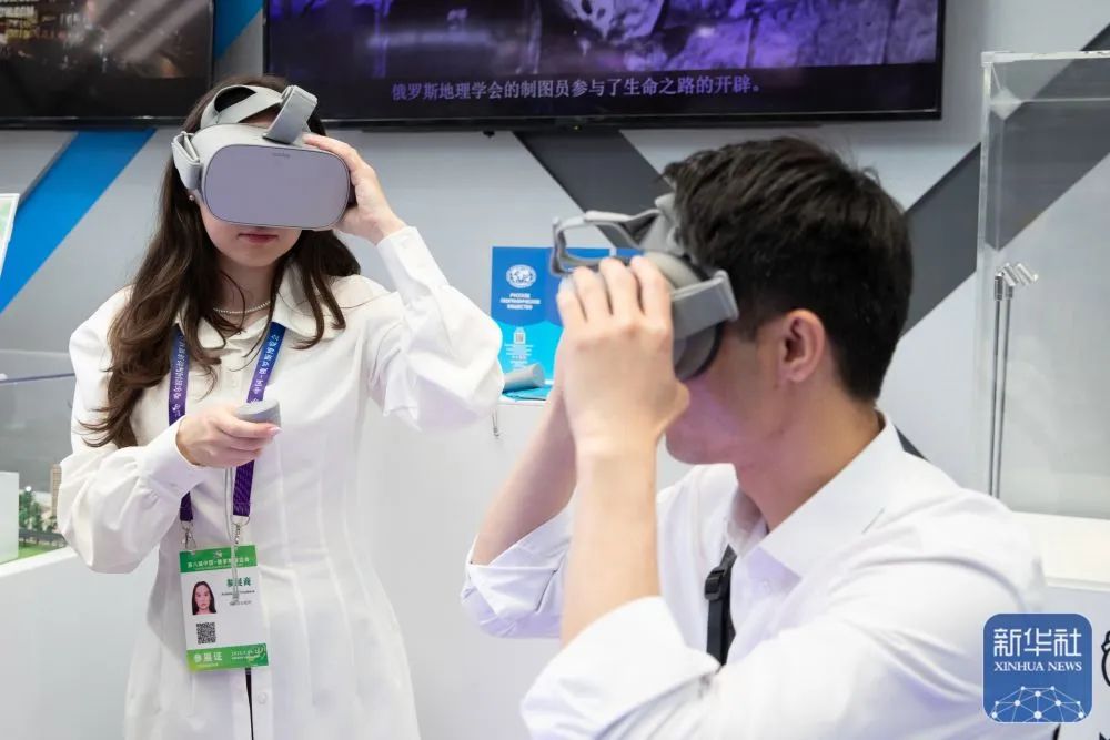 5月18日,在第八届中俄博览会现场,参会者通过VR技术观看俄罗斯生态风景。