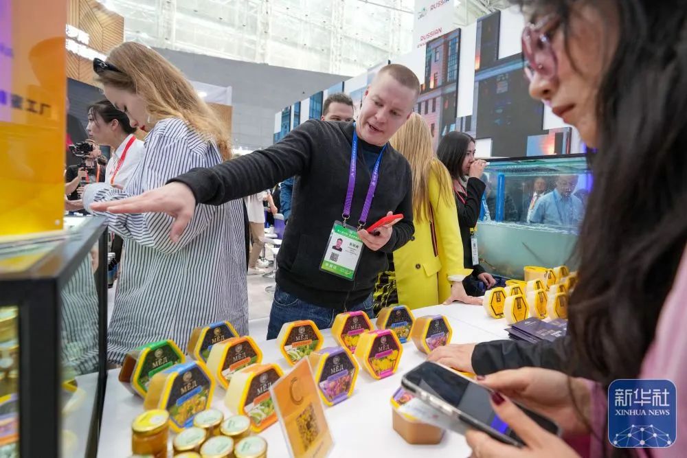 5月18日,一名俄罗斯参展商(中)在介绍蜂蜜产品。