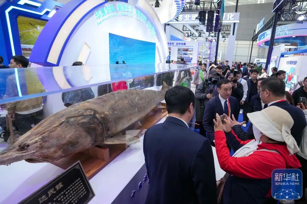 5月18日,参会者在佳木斯展区参观达氏鳇标本。
