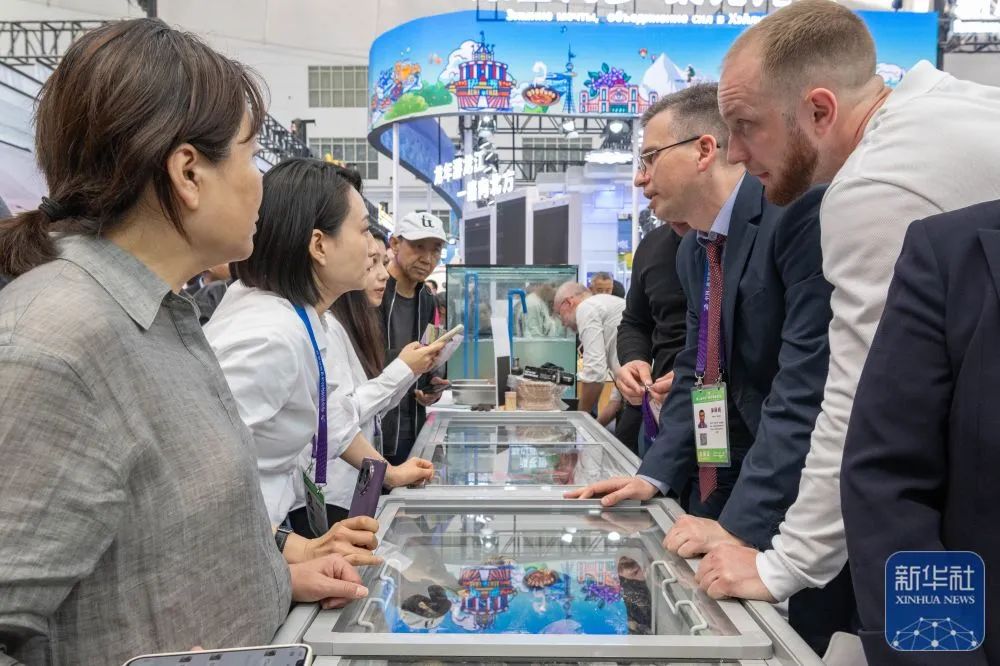 5月18日,几名俄罗斯客商在北大荒集团展区参观。
