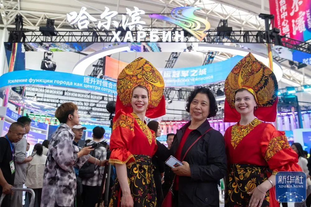 5月18日,在第八届中俄博览会现场,参会者与俄罗斯演员合影。