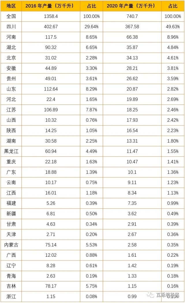 四川的白酒产量长期位居全国首位,大幅度领先于第二名的河南省(很遗憾,河南没有产生称霸全国的白酒品牌)。