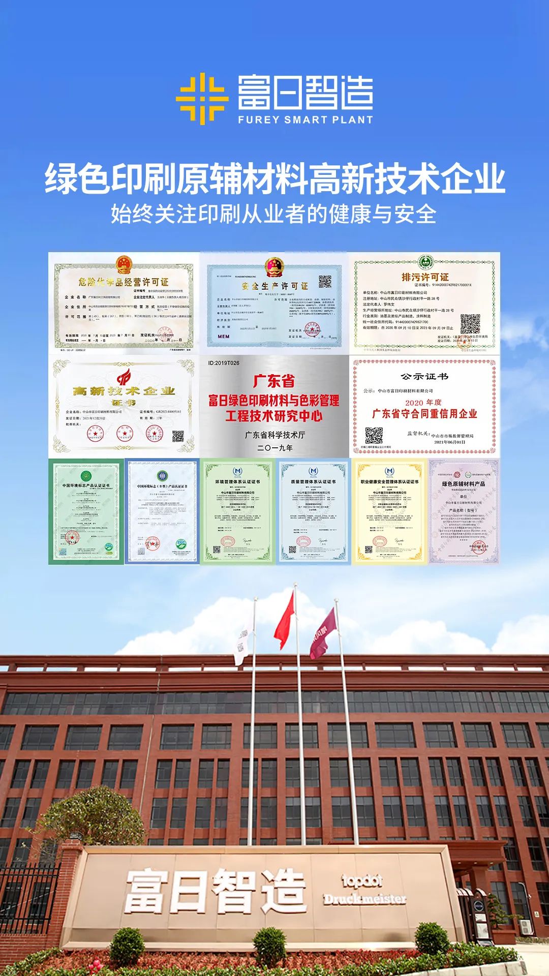 在生产和经营中,富日智造始终坚持“绿色环保、质量先行”的理念,建立绿色规范化管理体系,实施严格的产品质量管控。生产经营资质齐全,已取得危化品安全生产许可证、危化品经营许可证、全国排污许可证、ISO 9001质量管理体系认证、ISO 14001环境管理体系认证、OHSAS 18001职业健康安全管理体系认证、中国环境标志产品认证、绿色印刷原辅材料产品认定等。