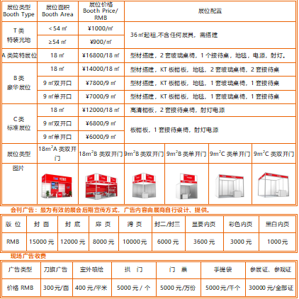 收费标准(标准展位3米*3米=9平米,双开口展位另加收1000元人民币)