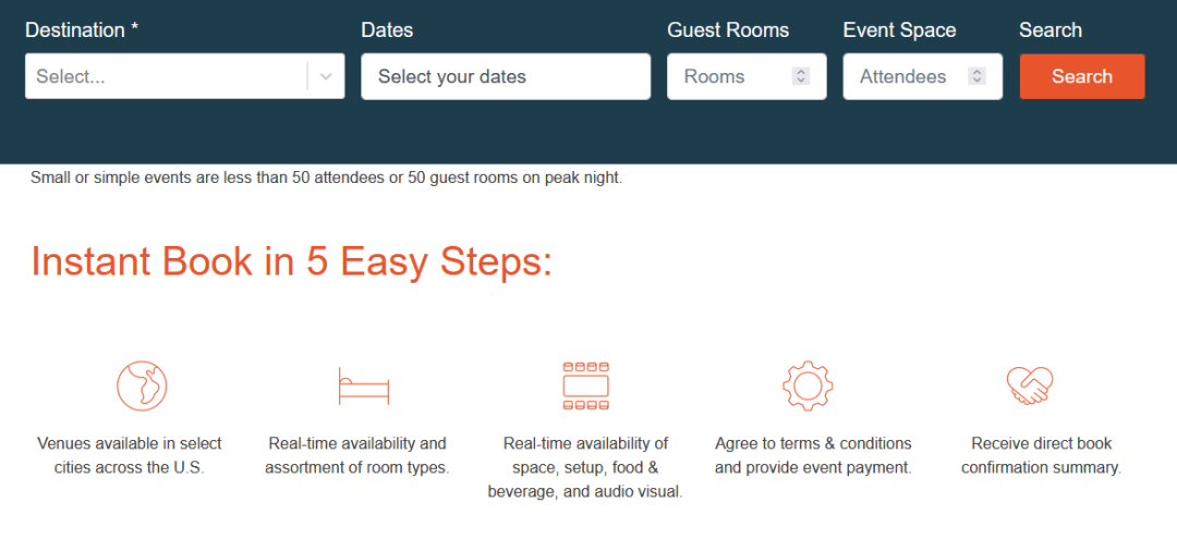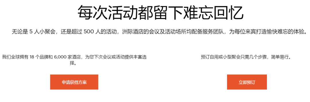 洲际官网的会议预订渠道也着重强调每一单会议都选择多样、预订便捷,无论是50人小聚会还是500人大型活动,力争为每一单会议客户提供愉快难忘的活动体验。