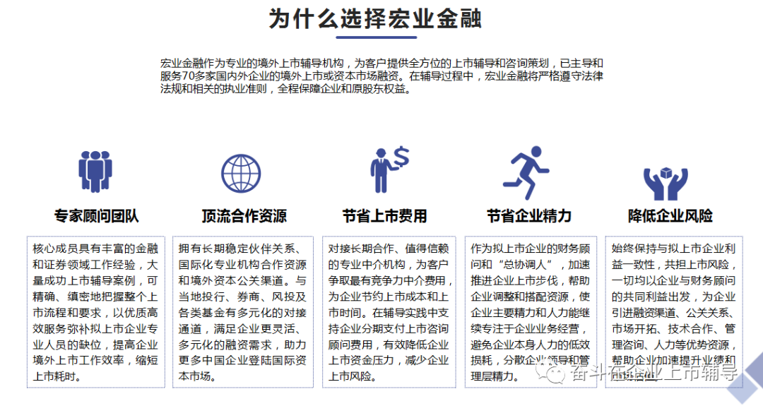 宏业金融集团是是一家国际金融咨询服务企业,主营业务有企业财务咨询、境外上市辅导、融资辅导、企业市值管理、企业收购与并购等企业金融服务,目前总部在深圳,另外在香港、美国、马来西亚均设有分公司,集团拥有专业的上市专家团队、丰富的辅导经验、广泛的社会关系、国际化的合作资源,通过一体化专业服务,为中国企业提供上市辅助服务,打造中国企业境外上市专业服务平台。企业上市咨询热线:18503056124周先生