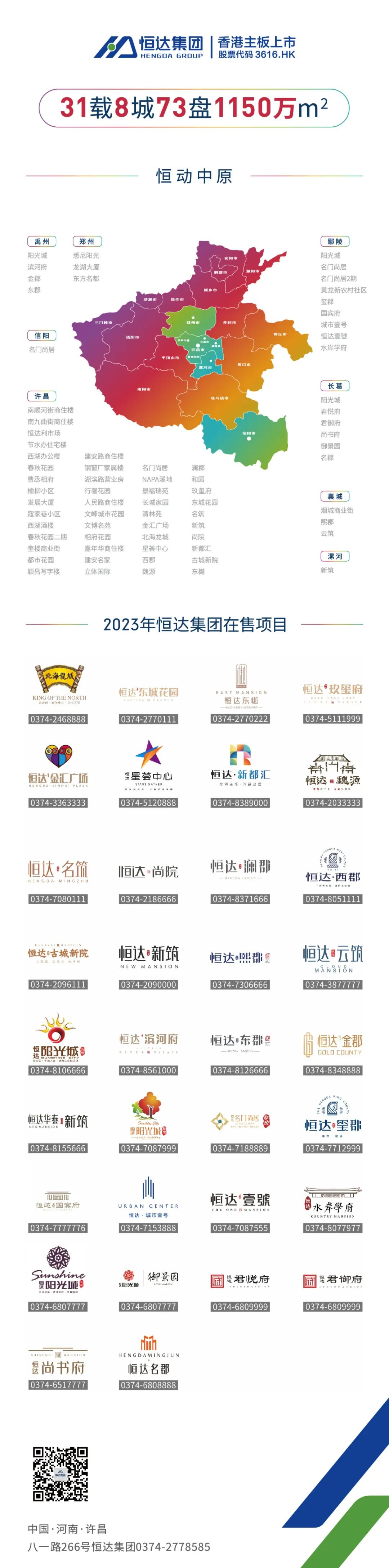 恒达集团成立于1992年,已发展成为以房地产开发为主,集商业运营、物业服务、装配式住宅、建筑施工等业务于一体的综合性企业集团。集团下属20余家房地产公司及20余家相关产业链公司,其中许昌恒达房地产集团有限公司和禹州市恒达房地产有限责任公司具有国家一级房地产开发资质。2018年11月12日,由集团房地产业务整合组建的恒达集团(控股)有限公司在香港联交所主板上市(股票代码3616.HK)。目前,房地产开发区域涵盖许昌市区和禹州、长葛、鄢陵、襄城以及省会郑州、信阳、漯河等地市。截至2022年11月,已经累计开发项目73个,已开发、在建及待开发面积约1150万平方米。恒达集团多次被评为河南省房地产开发优秀企业,连续多次进入河南民营企业100强,2020年被评为中国房地产企业最高信用等级AAA级企业,2021河南省房地产20强企业,2021年获得中国品牌博鳌峰会“中国行业标志品牌”荣誉称号,荣膺“2021值得资本市场关注的房地产公司”,“中国房企综合实力200强”。集团在注重自身发展的同时,积极投身社会公益事业,累计捐款4560余万元。恒达集团秉承“诚信经营,兑现每一个承诺”的经营理念,以产品和服务为立足点,坚持聚焦深耕、追求领先、高效运营以及大服务的发展战略,努力实现客户、社会、员工和投资者多方共赢。