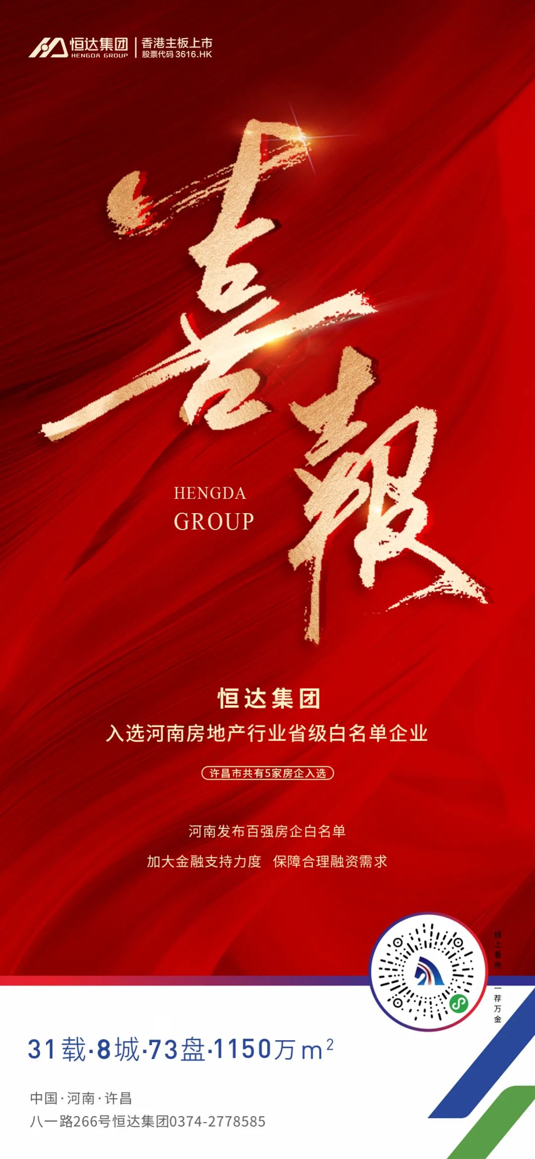《通知》要求,全省金融系统要坚持“两个毫不动摇”,对国有、民营等各类房地产企业一视同仁。要在市场化、法治化和商业可持续原则基础上,通过创新信贷产品、开辟绿色通道、降低融资成本等方式,努力满足白名单房企的合理融资需求。恒达集团此次被确定为河南房地产行业省级白名单企业,是各级政府、金融机构以及社会各界对集团在企业经营和发展方面取得的成绩给予的肯定。恒达集团将再接再厉,继续脚踏实地、稳步前行,为推动许昌乃至全省经济社会高质量发展做出新的更大的贡献!