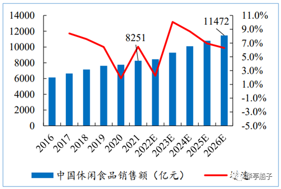 休闲零食,是人们在闲暇、休息时吃的食品,包括干果、坚果、膨化食品、饼干、果脯等。根据Frost&Sullivan的统计数据,2016年到2021年,我国休闲食品行业的市场规模从6128亿元增长至8251亿元,复合年化增速达到6. 1%,预计2026年将达到11472亿元。