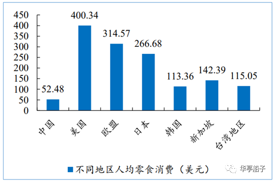 我国休闲食品的人均消费额较低,2021年仅为52. 48美元,而同期的美国、欧盟、日本分别达到400. 34美元、314. 57美元、266. 68美元,远高于我国。