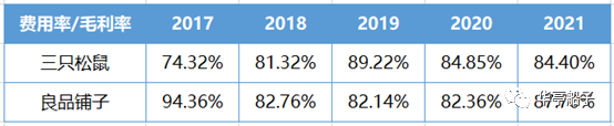 三只松鼠和良品铺子的【费用率/毛利率】均高达80%以上,远远高于洽洽食品。