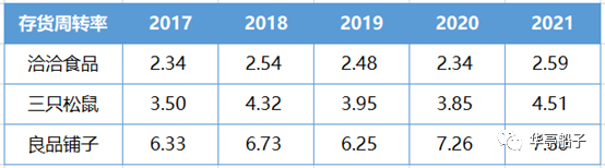 可以看到,洽洽食品的存货周转率基本在2. 5次左右,远低于良品铺子,也低于三只松鼠。