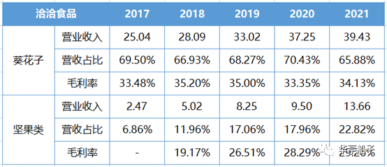 其中,葵花子业务是公司起家的传统业务,目前仍是最大的业务,2021年贡献营业收入39. 43亿元,营收占比高达67. 42%,,同时葵花子业务的毛利率也比较高,2021年为34. 13%.