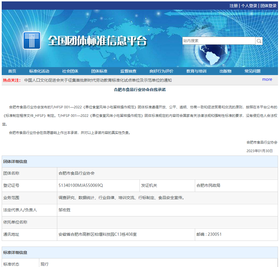 近日,在安徽省、合肥市市场监管部门指导下,由合肥市食品行业协会制定的全国首个《单位食堂风味小吃留样操作规范》团体标准(T/HFSP 001—2022)正式发布实施。该标准填补了行业空白,将为推进食堂食品留样工作管理标准化建设起到积极作用。