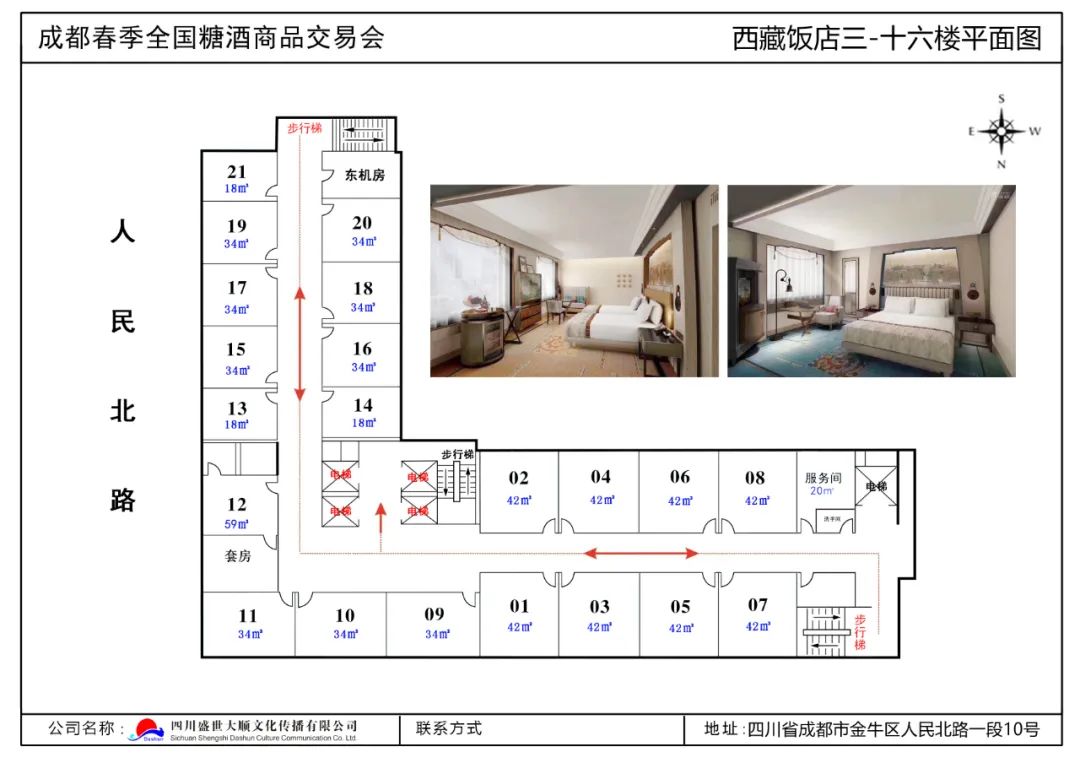 西藏饭店主楼总高17层,1.2.17楼展厅,3-16楼房间,呈“L”型。