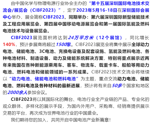 两年一届的中国电池展来了,将于2023年5月16日-18日在深圳国际会展中心举行。展会火爆程度体现了行业的快速发展,20天完成了20万平方展位的招商.为了满足电池产业链企业的参展需求,展会新开两个馆,展会总面积将会达到24万平方