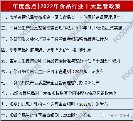 2022年,国家市场监督管理总局、国家卫生健康委员会等监管部门发布了一系列食品行业监管政策,2022年食品行业十大监管政策如下: