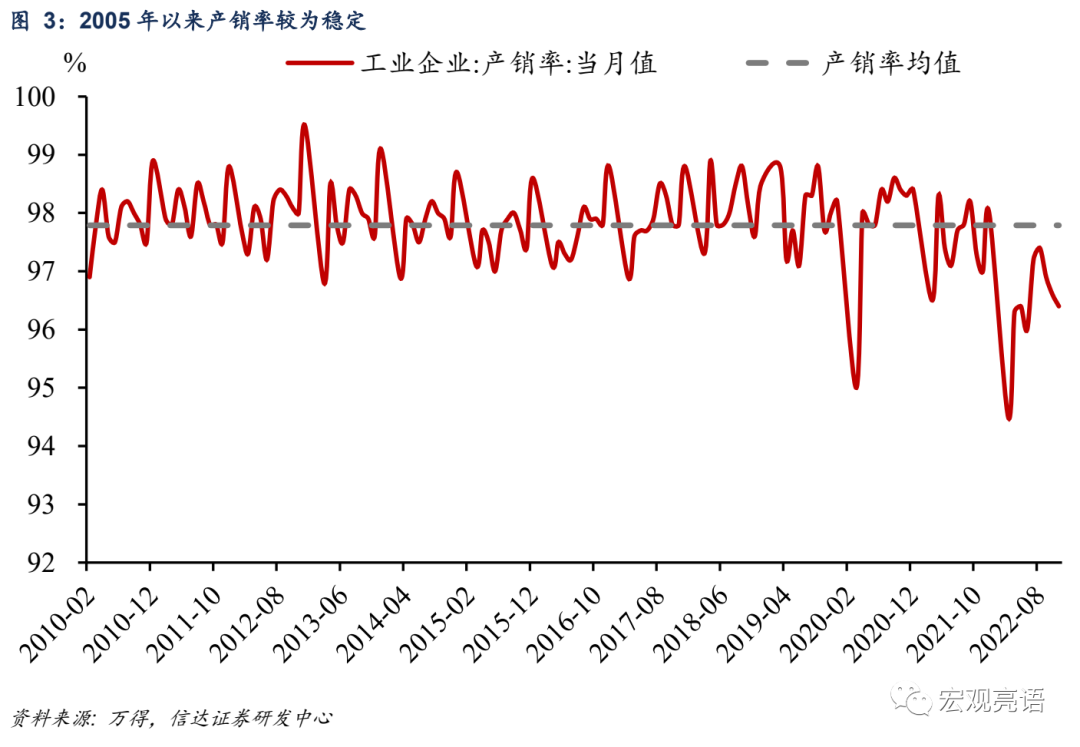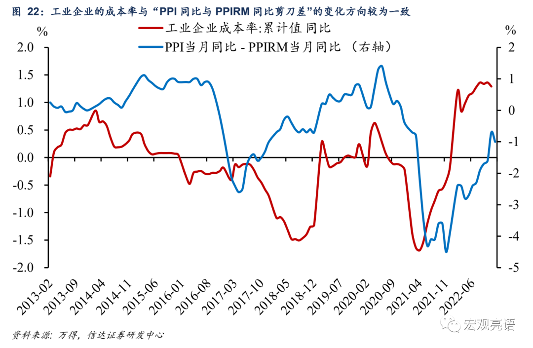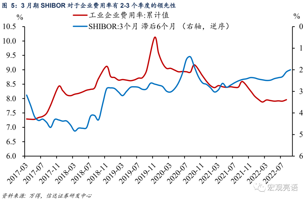 工业增加值增速反映工业生产实际增长速度。工业增加值是指工业企业在报告期内以货币形式表现的工业生产活动的最终成果;是工业企业全部生产活动的总成果扣除了在生产过程中消耗或转移的物质产品和劳务价值后的余额;是工业企业生产过程中新增加的价值。增加值的概念我们在第二篇方法论《月度GDP指数的构建与应用》中已做详细介绍。工业生产总值其实就是GDP中工业部分,国民经济各行业的增加值之和则为最终的国内生产总值(GDP)。(2)2004年至今,采用价格指数缩减法将现价工业增加值转换为不变价。以不变价计算的增加值增速反映扣除价格变动因素影响后工业生产实际增长速度我们此处再引入工业企业总产值的概念,工业总产值衡量企业的生产端,营收衡量企业的销售端。更具体地,工业企业营收,与工业企业总产值和产销率的乘积基本等价。自从2010年至今,产销率围绕均值98.0%浮动且较为稳定,因此工业企业营收和工业企业总产值的数值较为接近。而工业增加值等于工业总产值与增加值率的乘积。《月度GDP指数的构建与应用》中提到,本期增加值=本期总产出x上年度的增加值率。在增加值率确定的条件下,可认为工业增加值现价增速与工业总产值增速基本一致。所以也可以说,工业增加值增速反映了剔除价格变动因素后工业企业营收的变化。再看第二个因素PPI。PPI反映了工业企业利润增长中,价格的影响。在计算工业增加值时,PPI(生产价格指数)即为所使用的价格缩减指数。从另一个维度看,PPI也是衡量工业企业产品出厂价格变动趋势和变动程度的指数。在工业增加值中还原价格因素的变化,可以得出工业企业营收同比增速=工业增加值同比+PPI同比。从历史数据可以观察到,工业增加值增速+PPI同比,和工业企业营收增速拟合度较高,也佐证了这一结论。综上所述,工业增加值反映了量,PPI则反映了价。工业企业利润和利润率的关系可以用,利润=营业收入*利润率,这一公式来归纳。工业企业利润率的变化可以用工业企业营业收入利润率这一指标跟踪。工业企业利润约等于营业收入扣除营业成本、管理费用、销售费用、财务费用,因此观察成本以及各项费用可以帮助我们更好的理解利润率的变化。2021年,营业成本占营业收入比重为83.7%,三项费用之和占比均值为6.7%。工业企业的成本率与“PPI同比与PPIRM同比剪刀差”的变化方向较为一致。PPI表示产品的销售价格,PPIRM表示原材料价格,在PPI-PPIRM同比下降时,原材料价格相对于售价上行,此时企业的成本率提升,反之亦然。费用方面,费用率受企业融资成本的影响较大,资金价格是企业费用率的关键因素。数据显示,3月期SHIBOR对于企业费用率有2-3个季度的领先性。资金价格因素之外,我们还可以关注针对企业的扶持政策。2019年开始,减税降费政策频出,以及2022年推出的超2万亿的留抵退税,一定程度上解释了费用率的下降趋势。