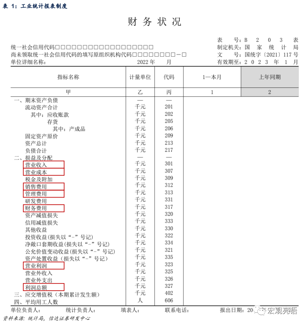 案例分析。四季度,疫情多发,消费低迷,下游需求不足,1-11 月工企利润同比下降 3.6%,降幅较 1-10月扩大了0.6个百分点。根据三因素框架拆解11月工业企业利润,产量和价格因素贡献下降,利润率持续拖累工企盈利。结构上,下半年以来,企业利润的一条主线是利润由中上游向中下游倾斜,行业利润结构持续改善。下游制造业在大类行业中表现最好,利润占比较上半年大幅改善。受制于终端需求偏弱,11月下游消费品的占比要逊于上半年水平,但从利润增速来看,下游消费品利润同比降幅已经连续6个月收窄,11月基本与2021年同期持平,展现出较强的恢复趋势。往后看,在上游成本端对利润的挤压减少,叠加疫情达峰之后终端需求逐步恢复,利润向中下游转移的趋势或将延续。前期受到压制的下游消费品行业无论是利润占比还是利润率均处于历史较低水平,未来可以重点关注消费行业盈利的修复弹性。对于单个企业,利润表是展示企业盈利能力的报表,是一家企业能不能创造价值最直观的体现。企业的经营情况如何,未来有没有发展空间,我们均可以通过该企业的利润表找到答案。对于一个行业也是如此,分析行业利润规模以及变动方向,可以帮助我们理解行业的现状以及未来的发展趋势。统计局披露的工业企业财务状况数据正是提供了一条获得行业盈利数据的官方渠道。统计局在统计企业财务状况时,既要考虑数据的及时性,同时也要保障源头数据的质量,因此对统计的范围与调查方式有着明确的规定。统计范围:规模以上工业企业,即年主营业务收入为2000万元及以上的工业法人单位。调查方法:(1)调查单位采取联网直报方式,严格按照各报表规定的调查内容、上报时间独立自行报送数据。(2)采用统一的统计分类标准和编码,统计机构和调查单位必须严格执行,不得自行更改。(3)按照《统计法》的要求,为保障源头数据质量,做到数出有据,调查单位应该设置原始记录、统计台账,建立健全统计资料的审核、签署、交接和归档等管理制度。(4)财务状况统计报表的上报时间一般为每月12日-18日(1月免报)。数据的发布机构为国家统计局,公布时间为次月27日(1月份除外)。规模以上工业对监测工业经济短期运行变化具有足够的代表性,而且调查频率高,时效性强。目前统计局披露的数据主要包含营业收入、营业成本、管理费用、销售费用、财务费用以及利润总额。为了更好地理解工业企业财务状况的各项指标,我们从公司会计角度简单梳理指标的含义以及数据之间的勾稽关系。1)营业收入指企业从事销售商品、提供劳务和让渡资产使用权等生产经营活动形成的经济利益流入。2019年起,统计局用“营业收入”指标替代了“主营业务收入”指标,后者不再更新。相较于主营业务收入,营业收入可以更全面地反映工业企业的收入规模。实际上,两者绝对值之间的差距不大,可以衔接起来使用。2)营业成本指企业从事销售商品、提供劳务和让渡资产使用权等生产经营活动发生的实际成本。2019年起, “营业成本”指标替代了“主营业务成本”指标,与营业收入的变化类似。3)三大期间费用为销售费用、管理费用、财务费用。销售费用指企业在销售商品和材料、提供劳务的过程中发生的各种费用,包括保险费、包装费、展览费和广告费、运输费等。管理费用指企业为组织和管理企业生产经营所发生的费用。财务费用指企业为筹集生产经营所需资金等而发生的筹资费用。4)营业收入扣除营业成本,再减去税金、三大期间费用、资产减值损失等成本费用科目,即为营业利润。具体公式为:营业利润=营业收入-营业成本-税金及附加-销售费用-管理费用-财务费用-信用减值损失-资产减值损失+公允价值变动收益(-公允价值变动损失)+投资收益(-投资损失)+其他收益+资产处置收益(-资产处置损失)5)营业利润加上营业外收入,减去营业外支出,等于利润总额。(二)“规模以上工业”统计口径的变化
