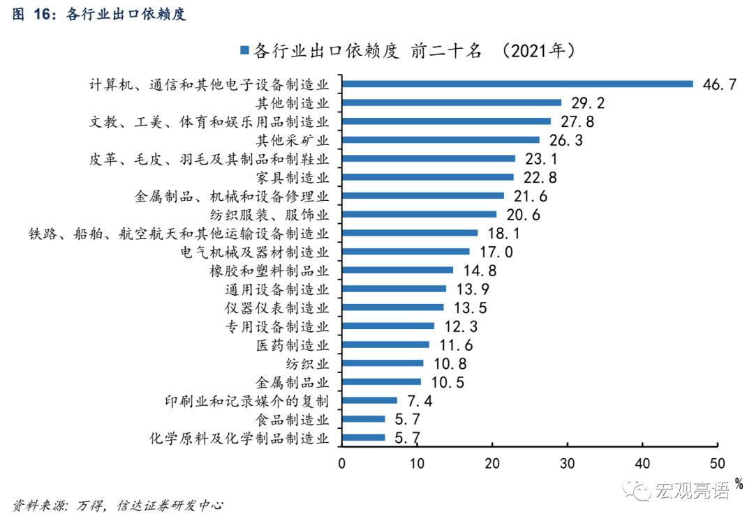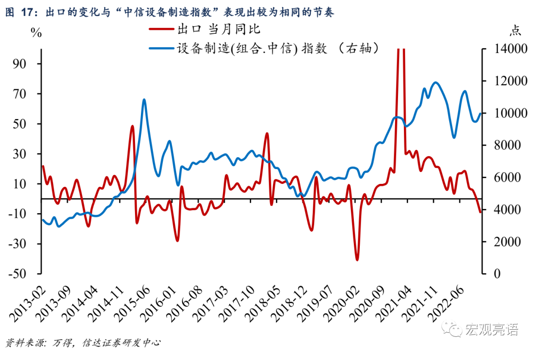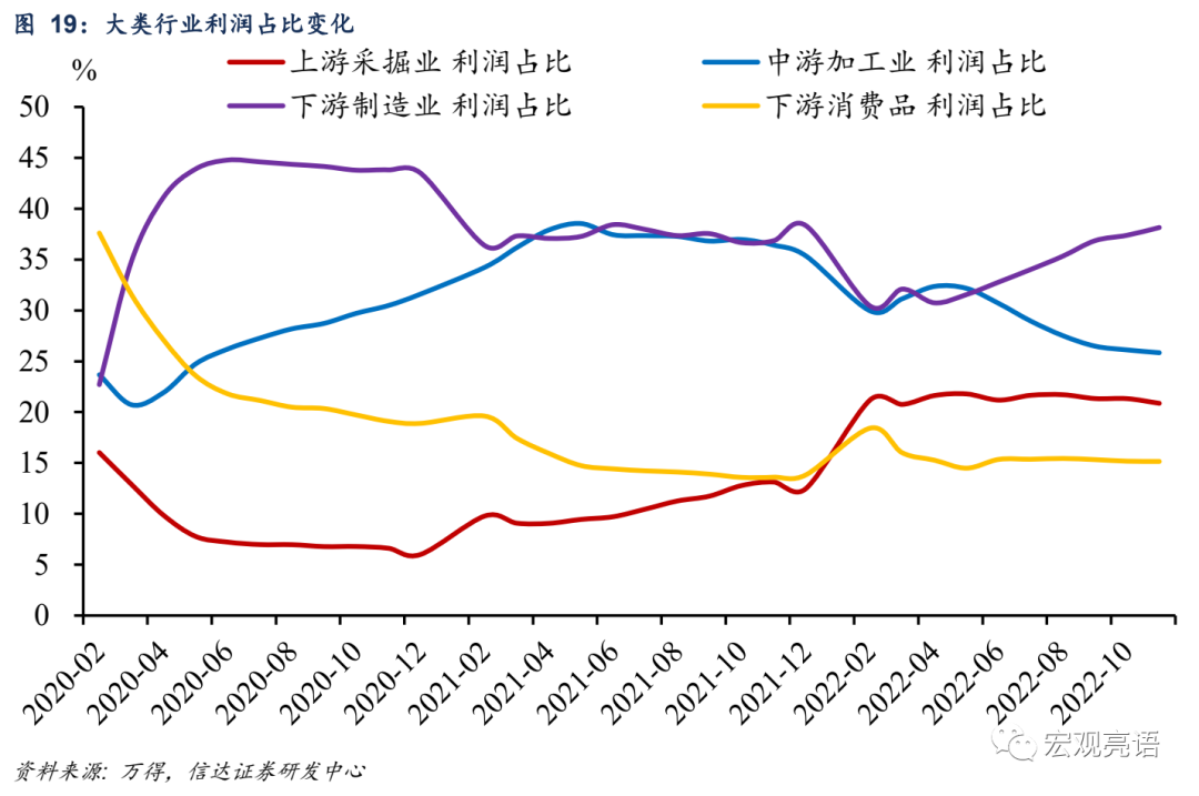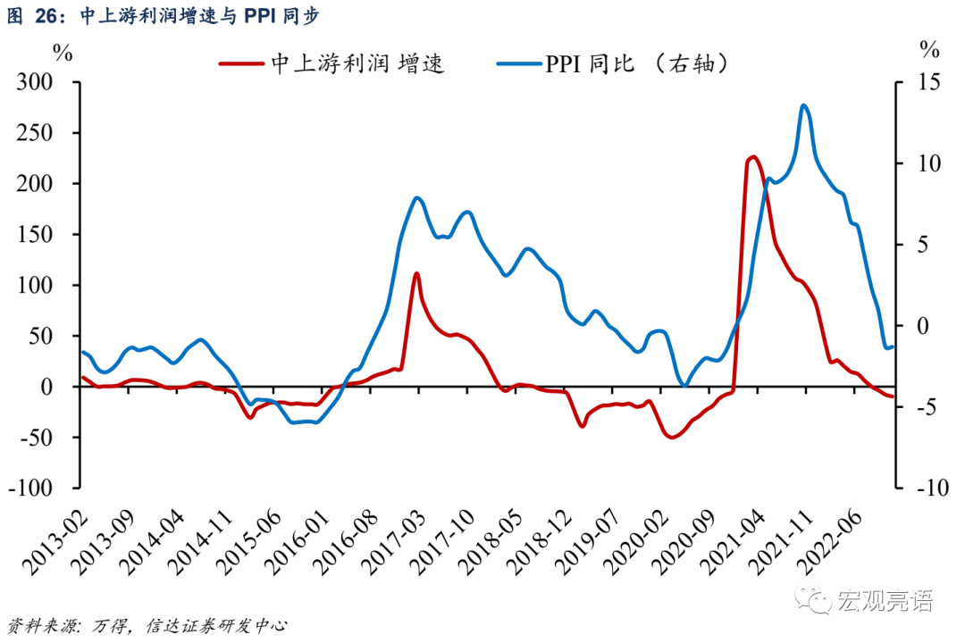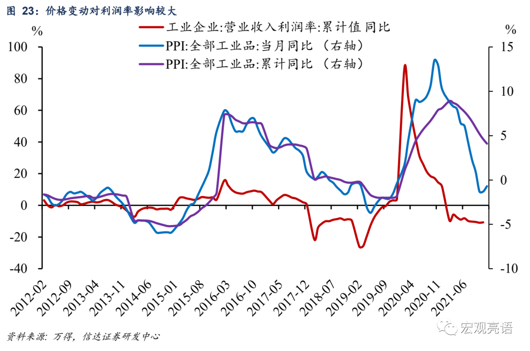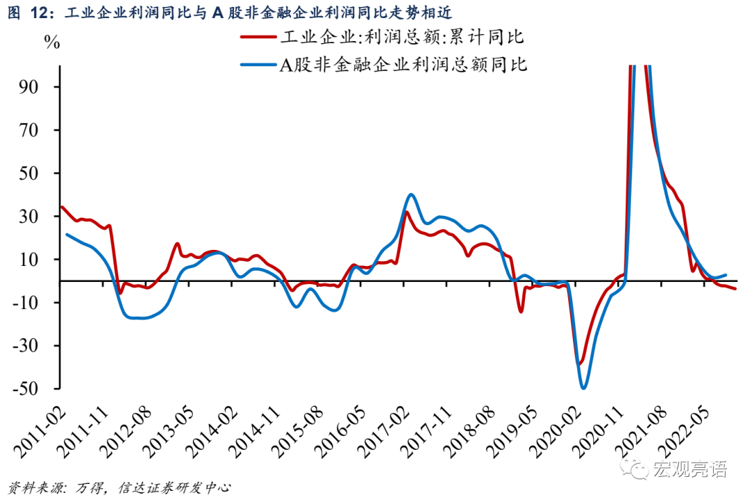 工业利润同比增速,反映了工业经济运行走势特别是工业经济短期运行状况,同时也是判断经济景气程度的重要指标。此外,工业企业利润与A股非金融企业利润的同步性较高。月度发布的工业企业利润数据相对于季度发布的上市公司财报,时效性更高,因此工业企业利润数据可以帮助我们预测企业盈利的变动趋势,投资者能够更加准确地评估企业基本面的强弱。根据股票定价模型 P=PE×EPS,PE与EPS共同决定了股价的跌宕起伏。PE为市盈率,反映估值,受无风险利率、风险溢价、预期增长等多种因素影响,EPS为每股收益,反映企业盈利水平。工业企业利润数据与上市公司EPS的概念是近似的,因此从宏观层面,企业利润数据是权益资产定价的重要“标尺”。我们也可以拉长时间线来看,2010年至2021期间,规模以上工业企业利润年复合增速为4.2%,万得全A指数年复合增速为6.4%,两者在增长水平上较为一致。我们进一步用各行业上市公司的利润数据与统计局公布的月度数据,测算两者的拟和性。第一步,我们汇总了2015年至2022年A股各行业上市公司每季度公布利润数据。第二步,考虑到各个时期数据的可比性,需要剔除2015年至2022年内新上市的公司。第三步,构建最小二乘法线性回归模型,各行业上市公司的利润总额累计同比为应变量,统计局公布的各行业利润总额累计同比为自变量。除去烟草制品业和金属制品修理业没有上市公司,以及非金属矿物采选数据不足,我们得到了33个行业的拟合优度和回归系数。我们判断,拟合优度和行业的集中度有关,回归系数的大小反映的是行业内部的分化。33个行业中,有11个行业的拟合优度高于0.6,这些行业的利润总额对同行业上市公司的盈利情况解释力较强,11个行业拟合优度在0.6与0.3之间,有一定解释力。而剩余的11个行业的拟合优度小于0.3,说明部分行业整体利润走势和上市公司的利润走势一致性较低。理论上,拟合优度和行业的集中度有关,集中度越高的行业拟合度越高。回归系数方面,回归系数大于1的行业,在整体行业盈利增速为正时,行业利润的提升意味着上市公司盈利有更为显著的上升,利润增速为负时,则反之。回归系数越大,上市公司盈利相对于行业整体越好。33个行业中,有6个行业回归系数大于2,13个行业回归系数在2与1之间,14个行业小于1。可以看出在大多数行业,上市公司的盈利能力要强于非上市公司。按照拟合优度和回归系数的大小,我们对行业进行归类。下图中左上方红框中的行业,月度利润数据对上市公司利润的预测能力较强,且上市公司的盈利能力要好于行业整体情况,因此对投资具有较强的指导作用。其中,计算机通信、金属制品、黑色金属冶炼、化学原料、纺织服装的拟合优度和回归系数均在较高区间。由于月度发布的工业企业利润数据发布时间比企业财报早,分行业的利润数据为估测上市公司盈利提供了一个有效的坐标。首先,上游采掘业与中游原材料加工业的利润表现均由PPI的变化主导,我们可以将两大类行业合并为中上游。我们在方法论十二——《理解 PPI 的波动原因与信号作用》曾论证了“三黑一色”(黑色金属、石化、煤炭,有色金属)是影响PPI走势的核心变量,PPI上行意味着这些大宗商品的价格走高。而中上游企业在市场上具有垄断性地位,集中度较高,因此价格的上升往往能够直接推动利润的高增。2013年以来,代表中上游资产的“中信原材料指数”与PPI同比的走势具有一致性(除了2014-2015年加杠杆带的一波牛市),其背后的逻辑就在于中上游的利润增速与PPI同比具有较强的同步性,价格的变化基本上决定了中上游盈利的变动。再看下游制造业。我们把工业企业各行业根据其出口交货值占营业收入的比重,分为出口依赖行业和非出口依赖行业,出口依赖度超过10%的行业为出口依赖行业,其余则为非出口依赖行业。2021年数据显示,计算机通信、文教体娱用品、皮革制鞋、家具、纺织服装出口依赖度排名靠前。此外,下游制造业各行业的出口依赖度普遍较高,如计算机通信、电器机械、通用设备、专用设备等。再加上规模效应对下游制造业的盈利能力有着显著的正向作用,这些因素都决定了出口的量对于下游制造业的利润、以及定价有着深远的影响。历史数据显示,出口的变化与“中信设备制造指数”表现出较为相同的节奏。最后是下游消费品。下游消费品的行业与居民消费较为贴近,因此很多人认为下游消费品的资产定价与社零联系紧密。然而事实上,消费板块的股价与社零的历史相关性非常低。我们推断,其原因一是由于2020年疫情发生之前社零同比增速十分平稳,相邻两个月的增速变化基本在1个百分点之内,导致其对于板块投资的指导能力偏弱;二是上文中提到,下游消费品既要承接中上游成本的压力,又需要根据终端需求的情况调整价格,社零只能反映量,却很难反映成本和利润。我们认为,下游消费品行业最主要的定价因素是利润率,利润率代表了议价能力,而议价能力是影响下游消费品行业在产业链中地位的关键。因此在2013年以来,我们可以看到消费板块资产走势与下游消费品行业利润率保持着较强的相关性。综上所述,我们总结出了各个大类行业的核心资产定价逻辑,即“中上游看价,下游制造业看量,下游消费品看利润率”。四季度,疫情多发,消费低迷,下游需求不足,1-11月工业企业利润同比下降 