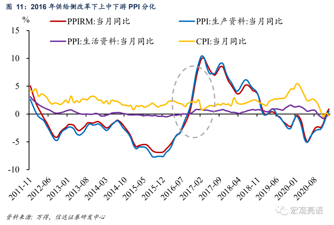 在终端需求强劲的情况下,下游行业会首先受益,利润上涨,量价双升,随后利润会传导至中游,以及上游行业。例如2010年,国际金融危机的负面影响在国内基本消失,由于国家多项政策刺激内需增加和出口回暖,中国经济快速回升向好,需求显著上升。2009年末下游消费品和制造业利润由终端需求带动,利润开始恢复。随后2010年初,利润传导至中游以及上游,中游上游利润同比走强。当供给端受到冲击时,上游和中游行业会受到较大影响,但利润能否向下游传导决定于终端需求。当石油及其他原材料价格的上升时,中上游行业利润增加。如果终端需求旺盛,下游行业能够把成本转嫁给消费者,而如果需求疲软,下游行业就必须承受更高的成本。2016年至2017年,在供给侧改革政策的影响下,大宗商品市场呈现出市场价格同比大幅上涨、行业利润明显增加、企业积极增产的良好态势。反观下游行业,一方面承接了中上游成本的抬升,另一方面受制于终端需求的低迷,成本难以向终端市场转移,行业利润受到一定挤压。从价格观察,代表中上游价格的PPIRM、PPI生产资料涨幅较大,而靠近下游的PPI生活资料以及CPI基本持平。经过上文的分析,我们已经理解了行业大类的划分方法和行业间的传导途径。那么工业企业利润对投资有什么启示?上中下游行业盈利的核心资产定价逻辑有什么区别?本章我们的视角从宏观转向投资,解析企业利润对于投资的指示意义。