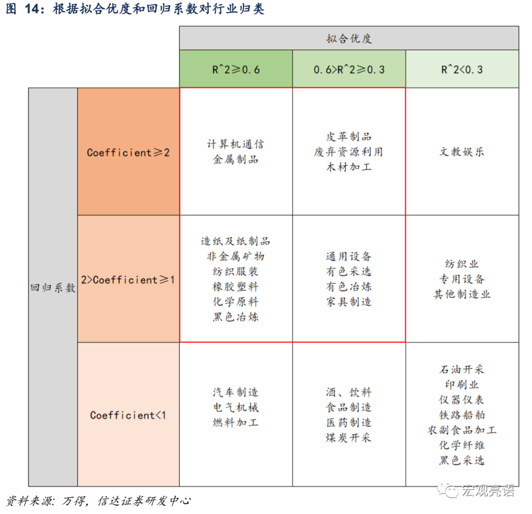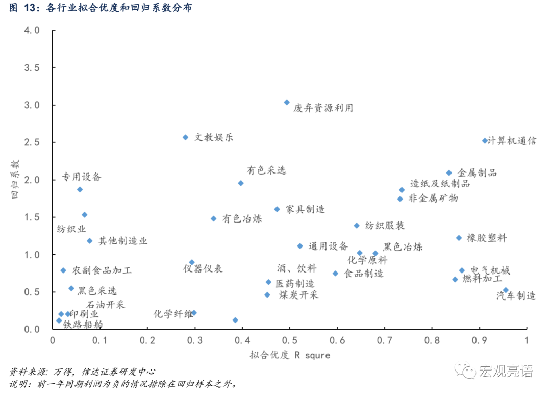 工业企业利润预测方法论:三因素框架。工业增加值增速反映了工业生产实际增长速度,PPI则代表了工业企业产品出厂价格,二者之乘积即反映企业营收。再考虑到利润率的影响,我们可以把每一期的工业企业利润同比增速拆分为,工业增加值同比+PPI同比+利润率同比。从理论上和实践上,这一拆分公式都能得到很好的验证。研究工业企业利润就是观察这三个分项的变化,并深挖它们变化背后的原因。从宏观到投资:企业利润的投资启示。(1)月度发布的工业企业利润数据相对于季度发布的上市公司财报,时效性更高,可以帮助我们预测企业盈利的变动趋势。工业企业利润数据与上市公司EPS的概念是近似的,因此从宏观层面,企业利润数据是权益资产定价的重要“标尺”。(2)我们用各行业上市公司的利润数据与统计局公布的月度数据,进行回归计算,得到了33个行业的拟合优度和回归系数,并筛选出了两个参数皆高的行业,这些行业的月度企业盈利数据对投资具有较强的指导作用。(3)行业比较在投资中至关重要,我们运用各行业的核心盈利驱动力,总结了不同大类行业的资产定价逻辑,即“中上游看价,下游制造业看量,下游消费品看利润率”。
