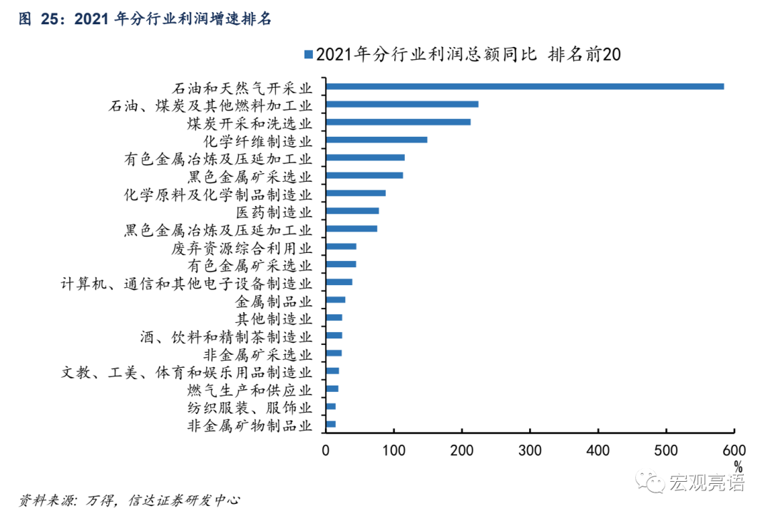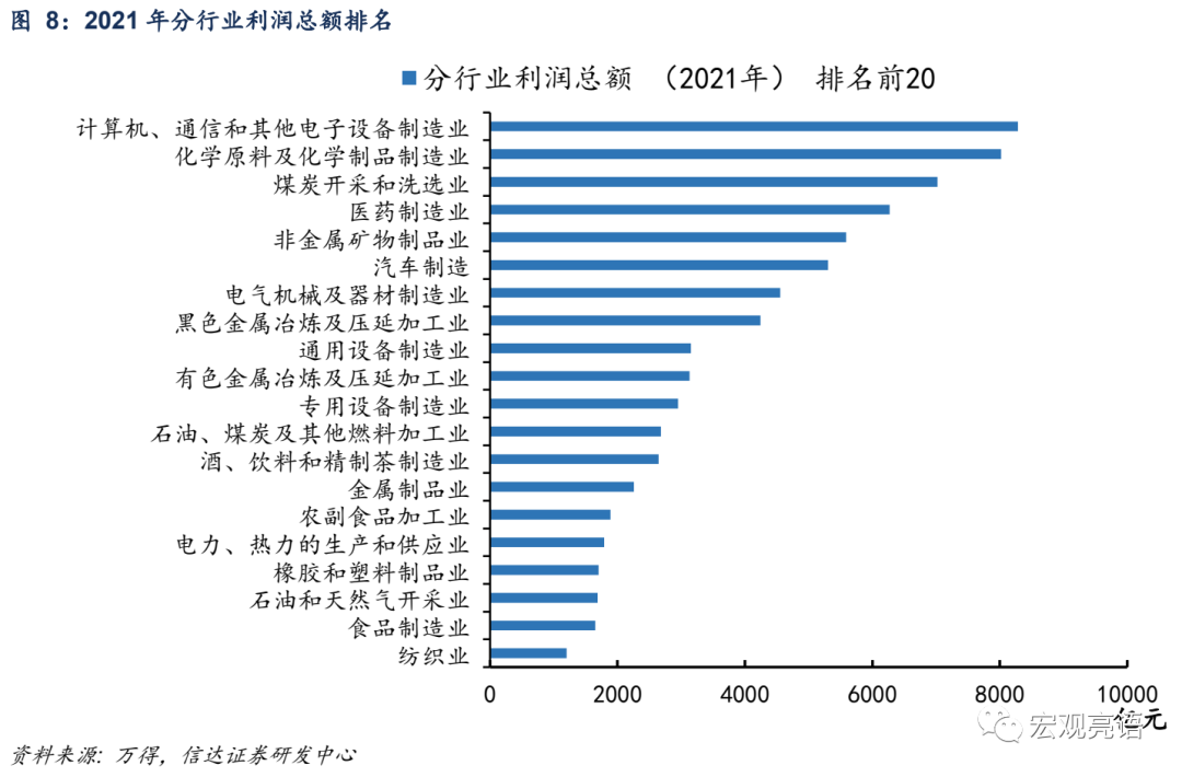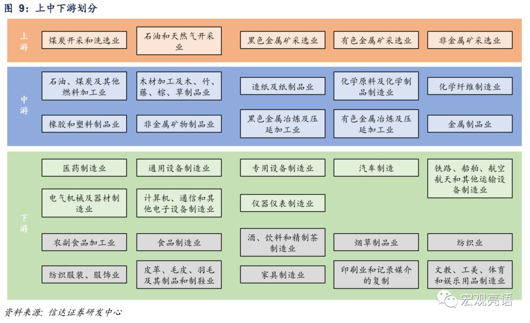 除了成本和费用,价格也是影响利润率的主要因素。从历史情况来看,PPI与利润率的变动趋势一致性较强。大宗商品的价格的上涨主要影响上游采掘业、中游原材料加工业的产品价格,从而提高企业的盈利能力。具体区分产业结构的方法将在下文介绍。2013年至今,利润率累计同比与PPI累计同比的相关系数为0.21,而它与PPI当月同比的相关系数达到了0.41,我们推测其原因在于利润率对于PPI的边际变化更为敏感。理解了模型的理论基础之后,我们在下面给出了工业企业利润三因素分析的数学证明过程:工业企业利润=产量(可用工业增加值作为代理变量)*PPI*利润率工业企业利润同比=工业增加值同比+PPI同比+利润率同比有df=d(xyz)=yzdx+xzdy+xydz有df/f=(yzdx)/(xyz)+(xzdy)/(xyz)+(xydz)/(xyz)工业企业利润的变化可以拆分为三个部分:工业增加值(量)、PPI(价格)、利润率。我们可以把每一期的工业企业利润同比增速拆分为,工业增加值同比+PPI同比+利润率同比。这一拆分,在理论和实践上完全可以得到证明。研究工业企业利润就是观察这三个分项的变化,并进一步深挖它们变化背后的原因。使用2017年至2022年11月的数据计算,利润总额累计同比与工业增加值+PPI累计同比+利润率累计同比的拟和优度相当高,达到了0.99,验证了这一公式的正确性。除了工业企业整体的财务数据以外,统计局每期还披露41个工业细分行业的月度数据。2021年,工业企业利润总额87092.1亿元。从行业结构来看,计算机通信、汽车制造业、化工、建材、钢铁等行业在我国工业企业利润中占比较大,占比排名前20的行业占了利润总额的87.3%。观察2021年全年各行业的利润同比增速,石油化工、煤炭、黑色金属冶炼、计算机通信等行业增速较快,对整体利润形成正向拉动。我们把工业企业中的41个行业,根据在产业链中的位置划分为上游、中游、下游。上游:重要资源和原材料的采掘,位于产业链的开始端,又称为上游采掘业。中游:以上游采掘业提供的原材料进行再加工的产业为中游产业,又称为中游原材料加工业。下游:中游产业提供的半成品作为原料进行深加工后,供应消费市场,为下游产业。下游又进一步分为较为靠近中游的下游制造业和离终端消费更接近的下游消费品。具体的行业划分可参考下图,下游中的浅绿色方框为下游制造业,灰色方框则为下游消费品。