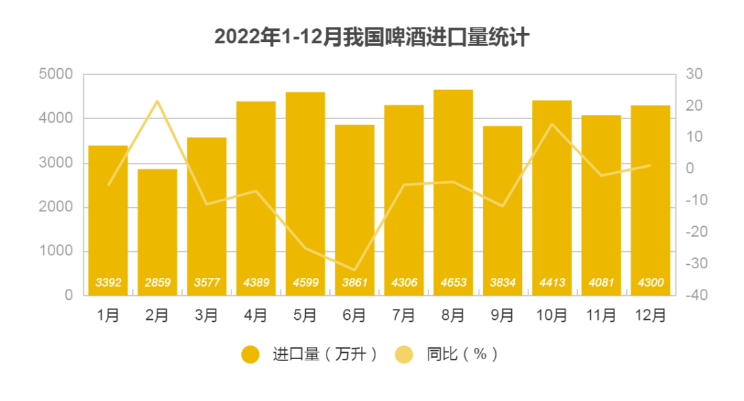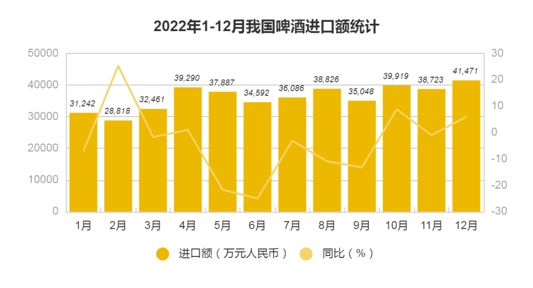 摘 要 | 日前,中国海关总署发布了2022年12月及全年进出口啤酒数据,年出口额与年进口额呈现逆反走势,贸易逆差规模进一步缩小。下面来了解具体情况。| 啤酒进口情况:2022年进口量额跌幅收窄,Q4进口额增长海关总署数据显示,2022年1-12月我国进口啤酒额整体呈回升趋势,12月啤酒进口额达到41,471万元人民币,比上一年同期增长6%,环比增长7%,刷新2022年历月进口额的新高。