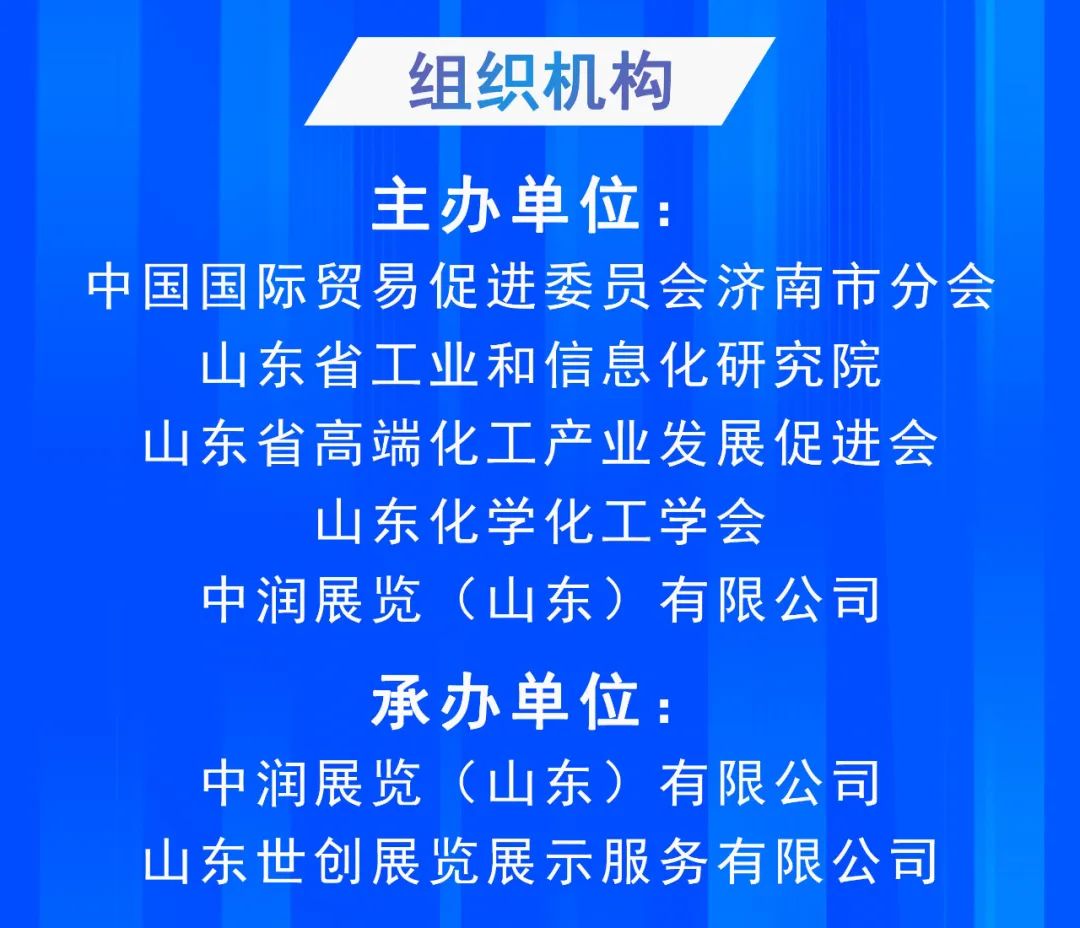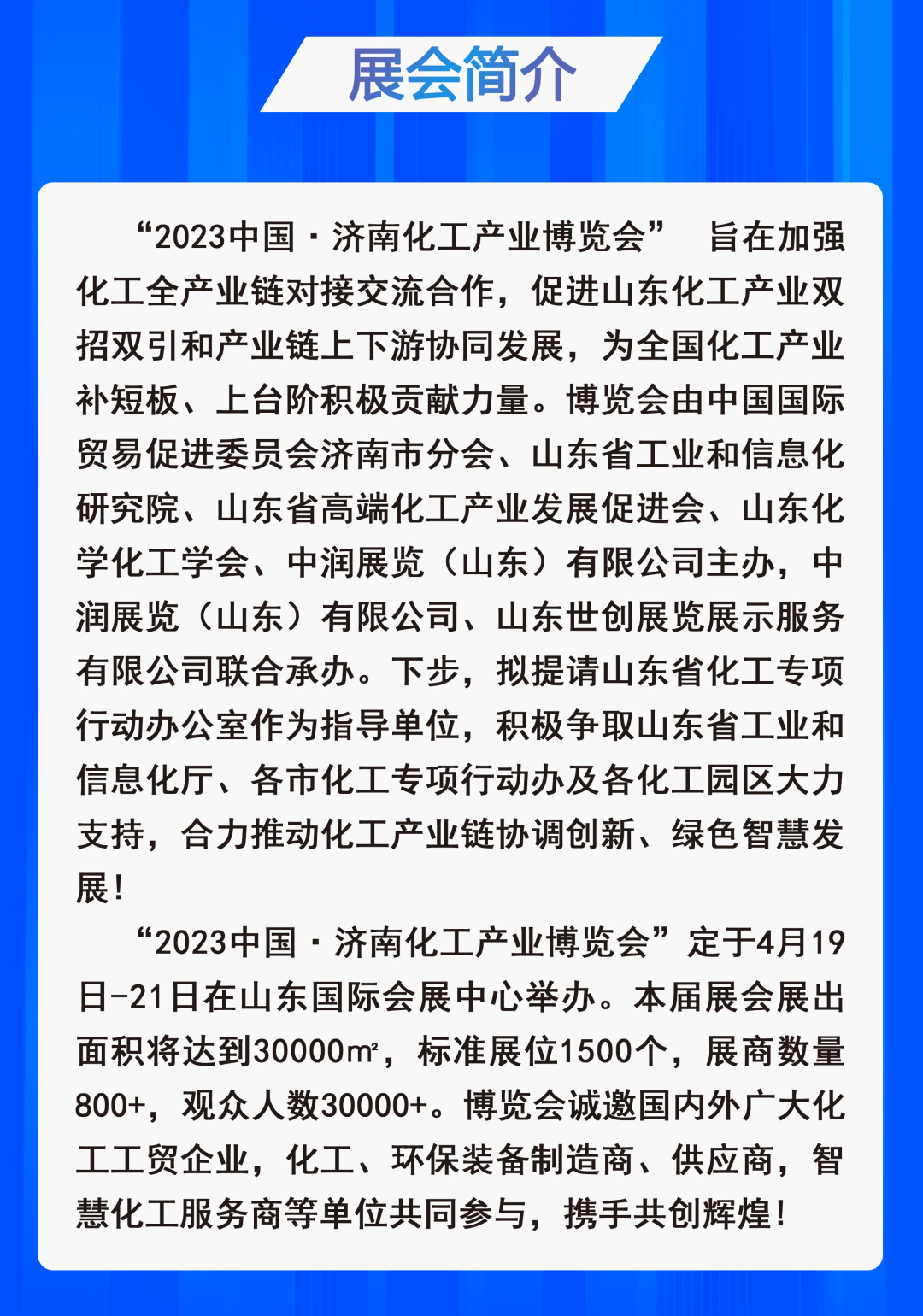 “2023中国·济南化工产业博览会” 旨在加强化工全产业链对接交流合作,促进山东化工产业双招双引和产业链上下游协同发展,为全国化工产业补短板、上台阶积极贡献力量。博览会由中国国际贸易促进委员会济南市分会、山东省工业和信息化研究院、山东省高端化工产业发展促进会、山东化学化工学会、中润展览(山东)有限公司主办,中润展览(山东)有限公司、山东世创展览展示服务有限公司联合承办。下步,拟提请山东省化工专项行动办公室作为指导单位,积极争取山东省工业和信息化厅、各市化工专项行动办及各化工园区大力支持,合力推动化工产业链协调创新、绿色智慧发展!