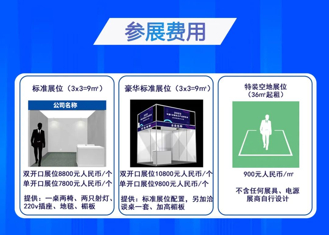 (2)豪华标准展位:单开口展位9800元/个;双开口展位10800元/个(在标准展位的基础上展位增高一米、增加洽谈桌一套)