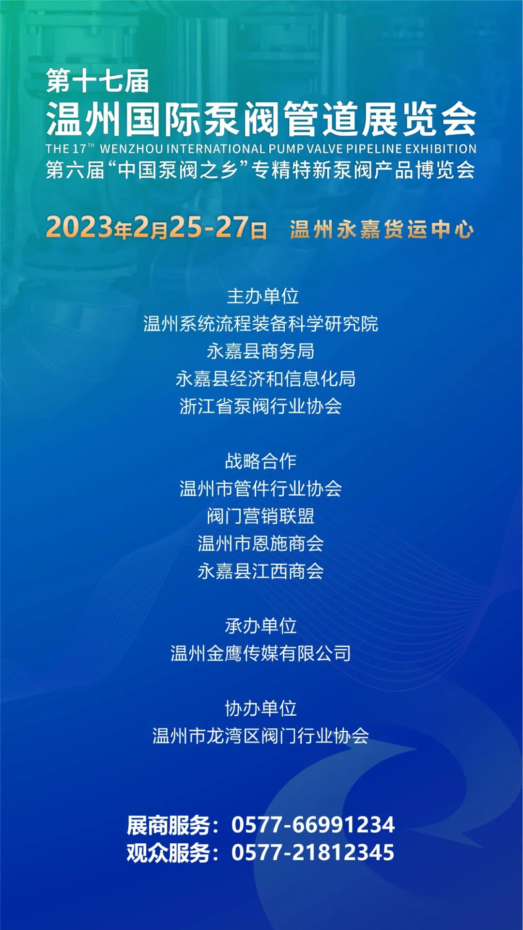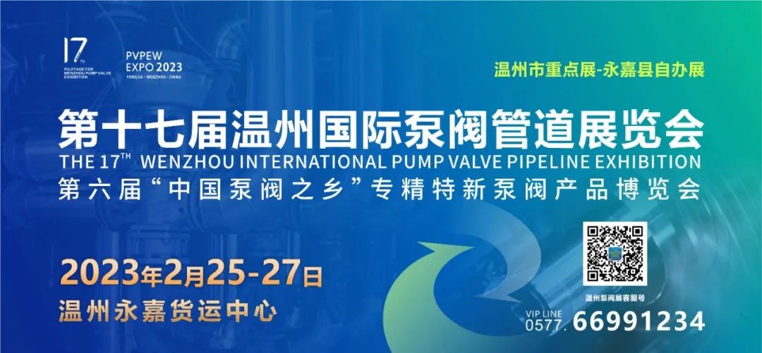 2023第十七届温州国际泵阀管道展览会暨第六届“中国泵阀之乡”专精特新泵阀产品博览会定档于2023年2月25-27日在温州永嘉货运中心举办。本届展会在规模、品质、衍生服务层面继续全面升级,全方位展示泵类、阀类、管道、执行机构、机械设备、配件、气动元件等新技术及产品,为泵阀行业领域提供优质的产品、新的技术和解决方案,与行业同仁共同打造全球性覆盖泵阀管道全产业链的具有前瞻性、开拓力、影响力的泵阀盛会。