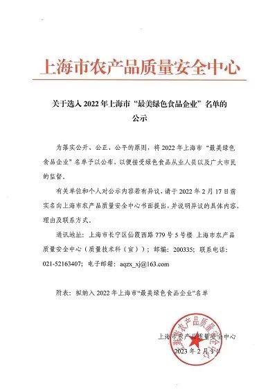 为推进绿色农产品品牌宣传,提升绿色食品的知名度、美誉度,发挥企业主体意识,营造绿色食品企业发展比学赶超的氛围,上海市农产品质量安全中心在2022年度“春风万里 绿食有你”绿色食品宣传月(上海站)活动期间,开展寻找上海市“最美绿色食品企业”活动。