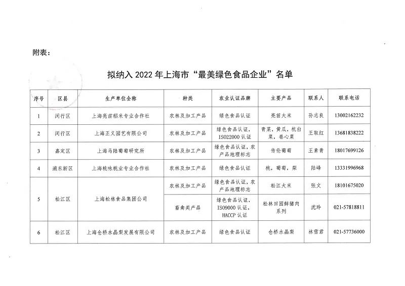 本次活动以各区工作机构积极推荐和绿色食品生产企业自愿申报相结合的方式展开,市农安中心组织专家通过对多家候选企业进行技术评审,确定将上海松林食品集团公司、上海亮苗稻米专业合作社等10家绿色食品生产企业纳入2022年上海市“最美绿色食品企业”名单。现将相关信息予以公示,敬请广大市民朋友们持续关注。