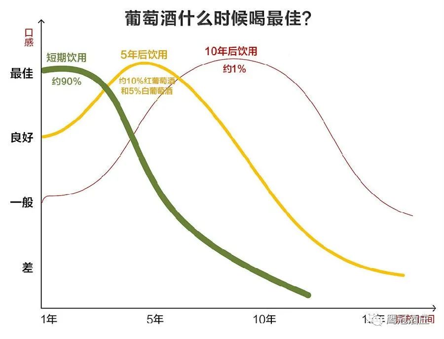 当然,除了以上这些葡萄酒之外,世界上还有很多经典的葡萄酒可以长期陈酿。不过,我们依然需要记住的是,90%的葡萄酒都不具有长期陈酿的潜力,正如下图所示: