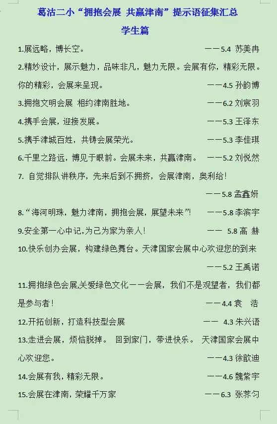 学校师生、家长用心编辑“会展”提示语,倡导大家要展现津南人的文明素养,以主人翁的姿态助力会展,为办好家门口的会展首展凝心聚力。截至目前我校共征集、筛选出80余条提示语。