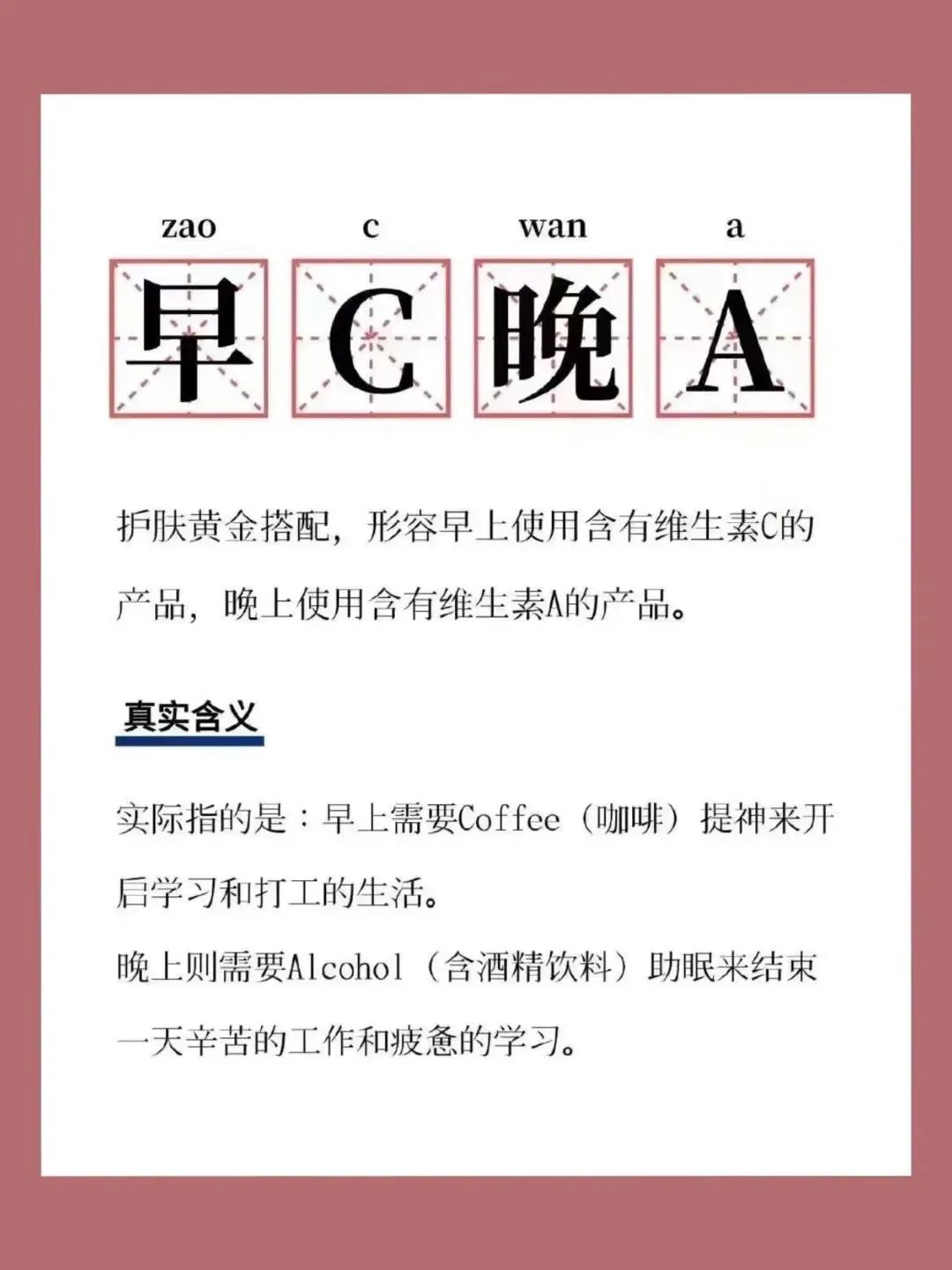 但是在当代大多数人这,哪有什么维C维A,只有早上一杯Coffe(咖啡),精神好;晚上一杯Alcohol(酒),睡得香!