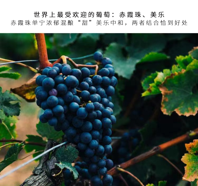 用口感也更加“甜”的美乐,来弱化赤霞珠的干、涩口感,两者结合恰到好处~