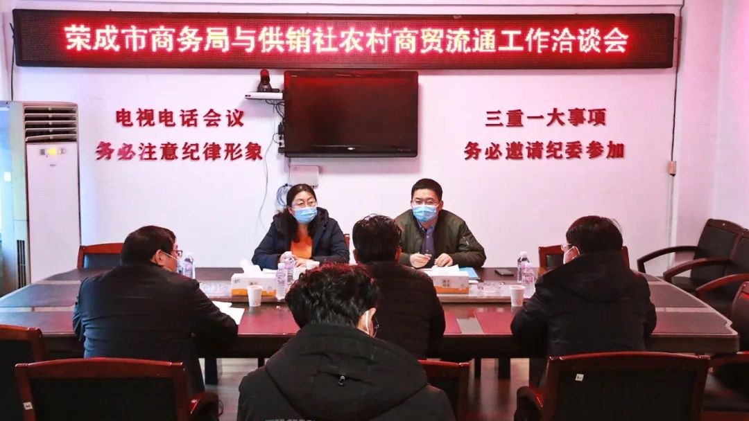 为加快我市农村商贸流通工作进一步发展,强化县域商业流通体系建设,2023年2月1日,荣成市供销社、市商务局召开农村商贸流通工作洽谈会。供销社党组书记、理事会主任宋豁然,商务局党组成员、招商促进中心主任张承荣出席会议。