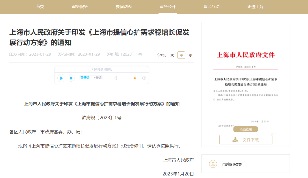 2023年1月29日,上海市人民政府印发《上海市提信心扩需求稳增长促发展行动方案》,提出10项行动共32条举措大力提振市场预期和信心,其中包括支持会展行业恢复重振,支持各类展会加快复展等。
