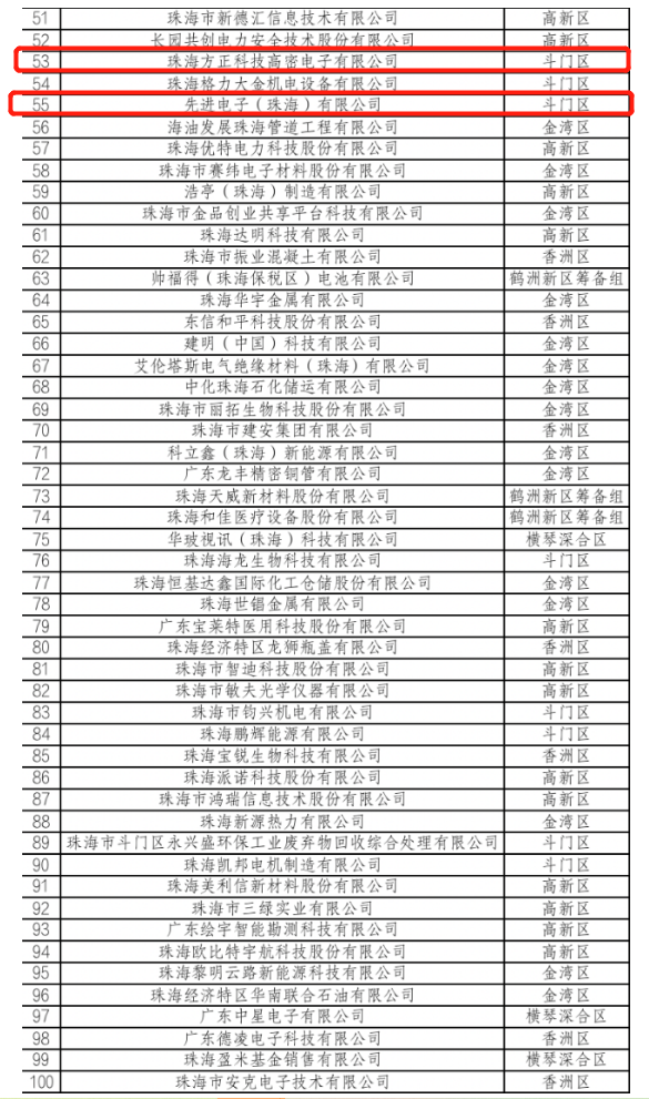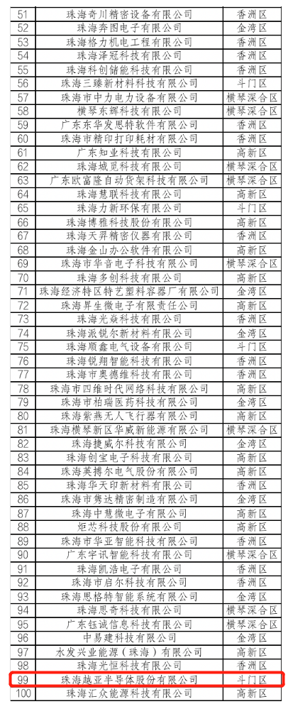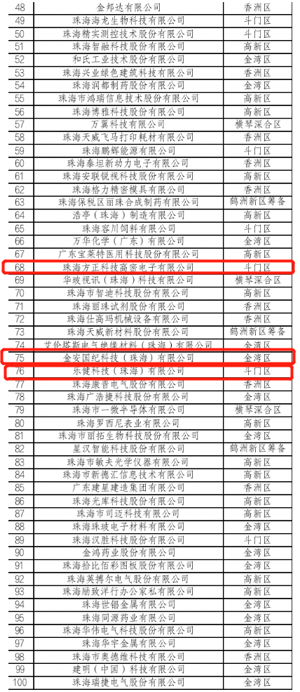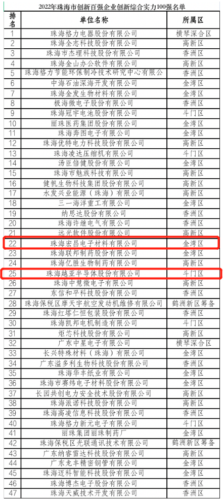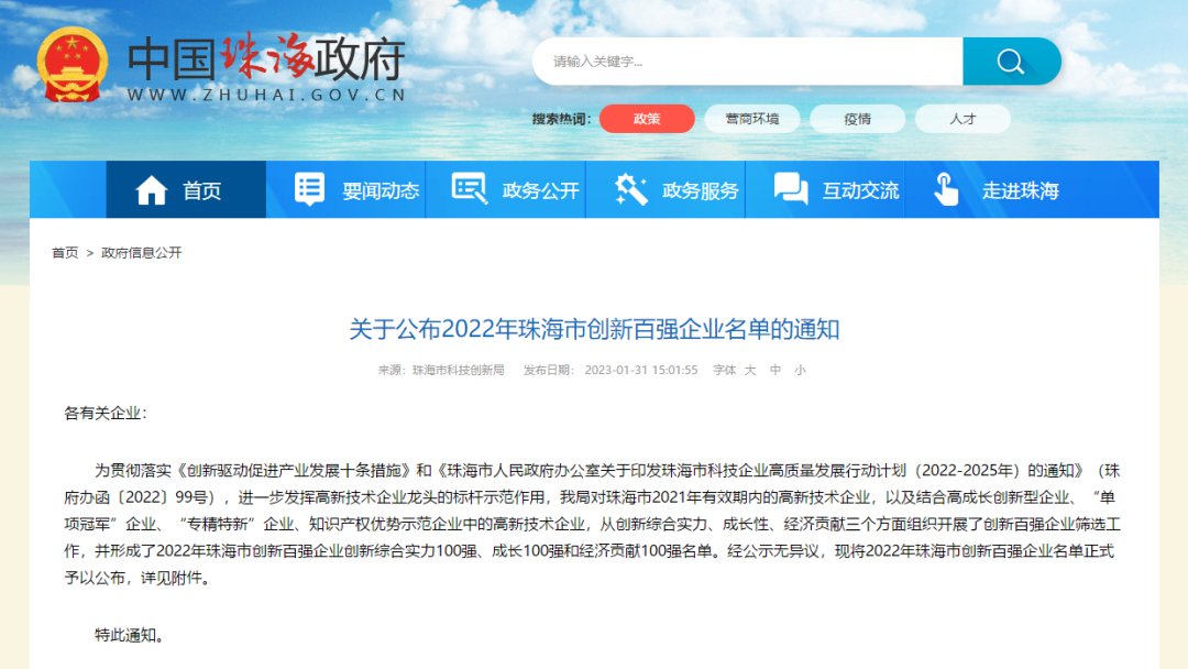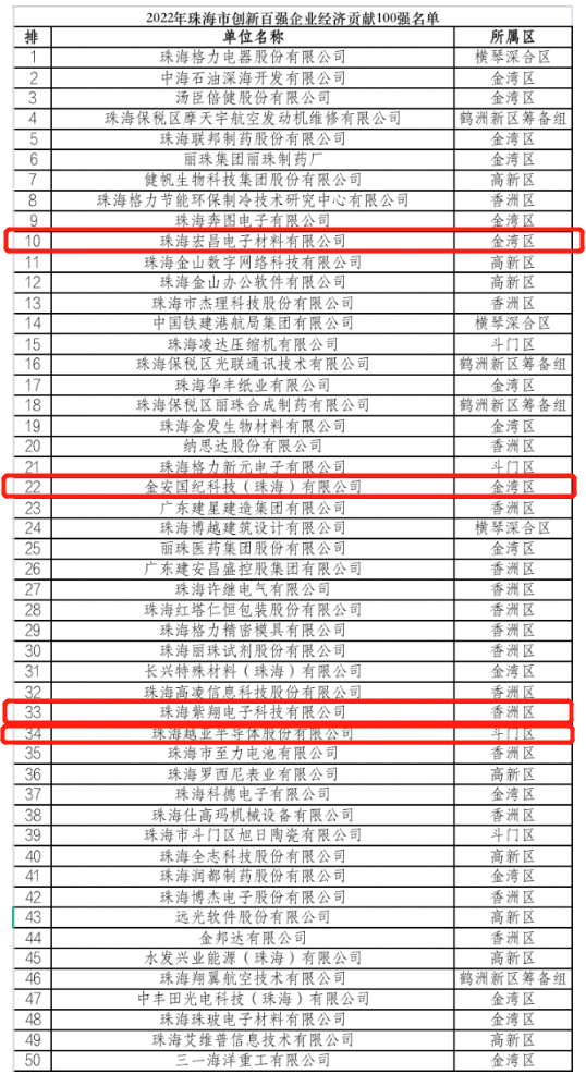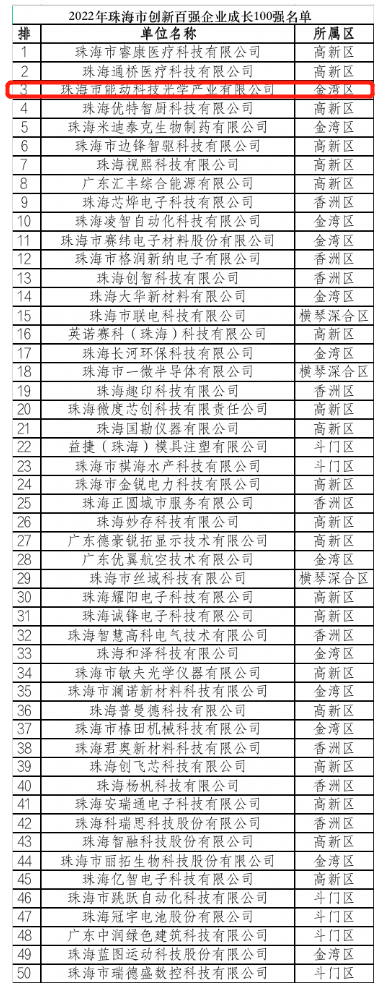 2023年1月31日,珠海市科技创新局公布了2022年珠海市创新百强企业名单。该名单面向珠海市2021年有效期内的高新技术企业,并结合高成长创新型企业、“单项冠军”企业、“专精特新”企业、知识产权优势示范企业中的高新技术企业,从创新综合实力、成长性、经济贡献三个方面评选出了2022年珠海市创新百强企业创新综合实力100强、成长100强和经济贡献100强名单。