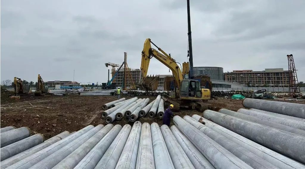 在项目工地,叮叮咚咚声不绝于耳,为春节增添了别样的热闹氛围。两台管桩静压桩机正在持续施工作业中,项目展示中心主体结构施工已经完成,建设者们正有序开展拦河玻璃安装等专业装修施工,确保3月底实现对外开放。
